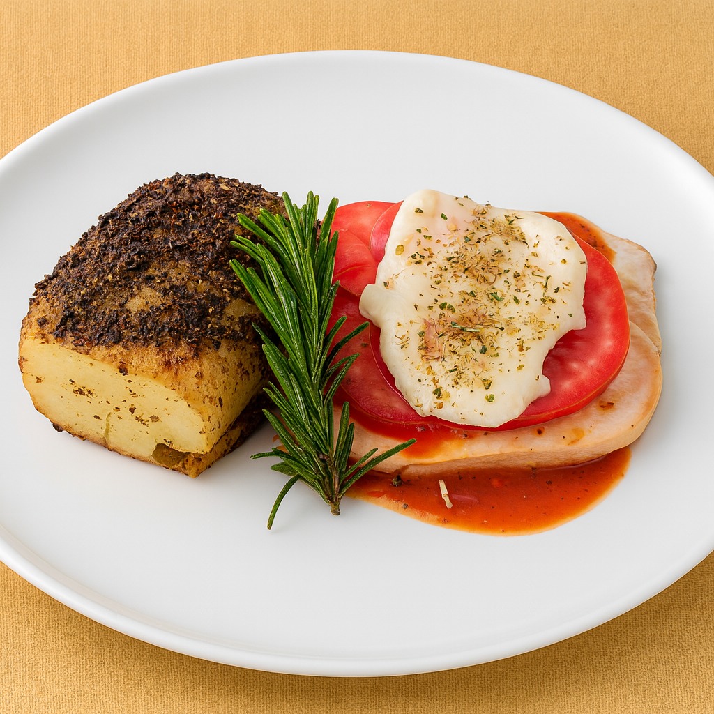 Suprema de pollo, papa, queso port salut light, tomate, orégano.