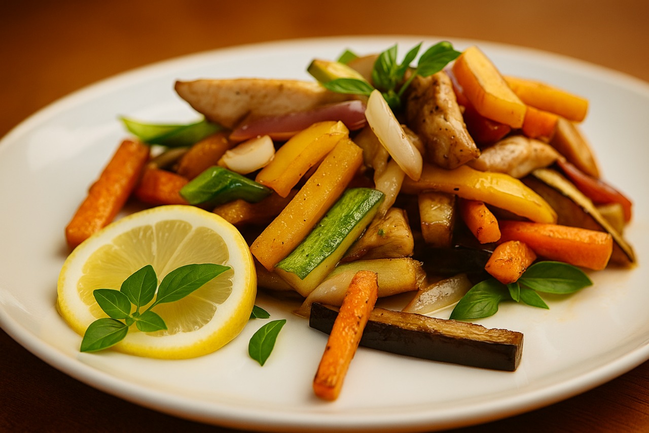 Supremas de pollo trozadas, vegetales de estación, brotes de soja, semillas de sésamo, salsa de soja.